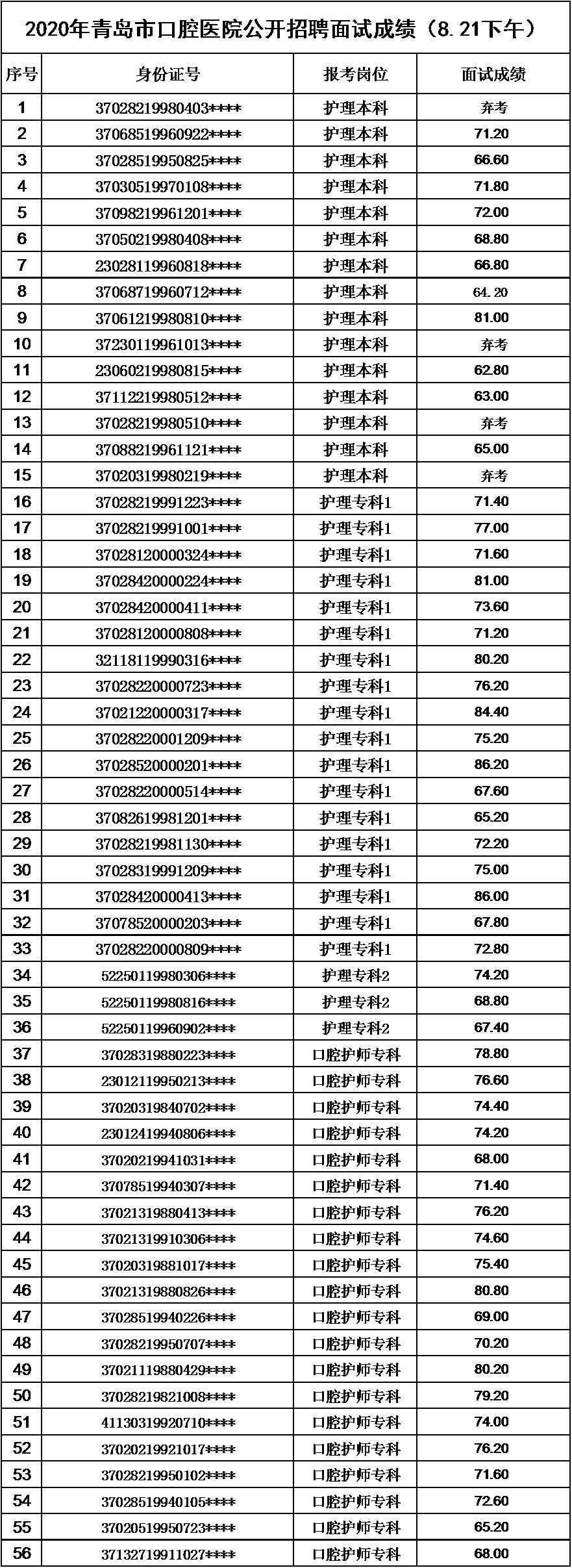 2020年青岛市口腔医院公开招聘工作人员面试成绩(下午)