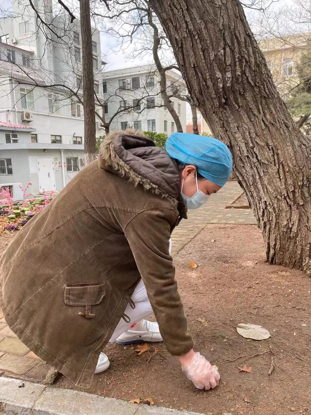 活动中,科室医护人员带着手套,拿着夹子、扫把等,认真清理医院前院、后院等区域的烟头。天气虽然寒冷,但大家的热情却十分高涨,大家时而站起,时而蹲下,一个个小小烟头被清扫干净。