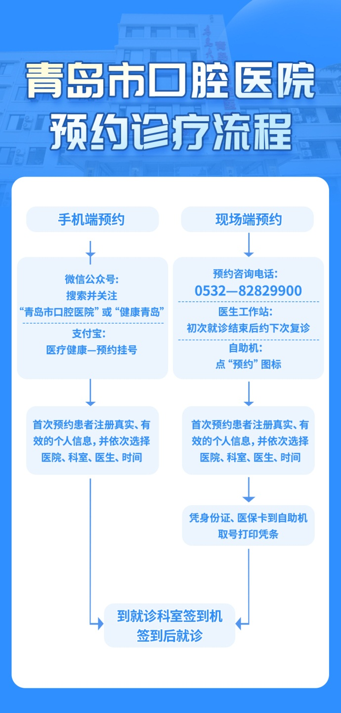 我院现已开通的预约方式有:电话预约、微信预约( “青岛市口腔医院”公众号、“健康青岛”公众号)、PC客户端预约(“青岛市口腔医院”官网、“青岛市居民健康信息服务平台”)、现场预约(自助机预约、诊间预约)、电话预约(0532-82829900)等多种方式。