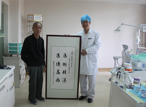 经了解,在今年的4月份举行的“为60周岁以上低保无牙颌患者免费安装义齿项目”培训过程中恰巧需要一位无牙颌患者配合做现场示教,来修复科就诊的胡大爷不仅配合现场示教,在时间上也是积极配合,使得培训过程圆满结束。5月份,胡大爷的全口假牙做好了,使用过程已经没有任何不适。胡大爷说:“经过此事,自己被口腔医院的这种真心真意为人民服务的精神所感动,也佩服口腔医院修复科精湛的医疗技术”。故此,胡大爷亲自挥毫泼墨,写了一副字画,并请人装裱好,送到口腔医院,以表自己的一份心意。