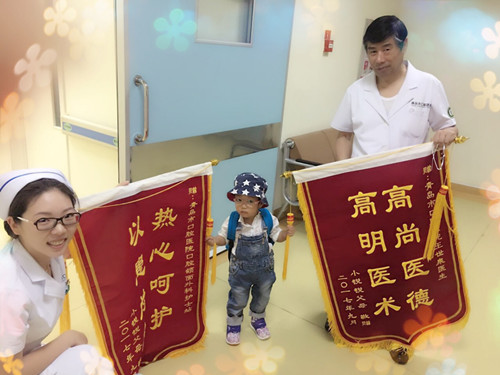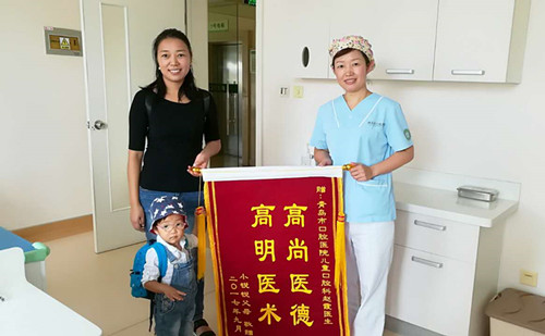 2017年9月15日上午8:30,医院病人服务中心接到喜报,2岁半的小患儿锐锐在爸爸妈妈的陪同下,为儿童口腔科赵霞医生、病房护士站和麻醉科王世泉医生送来三面锦旗。