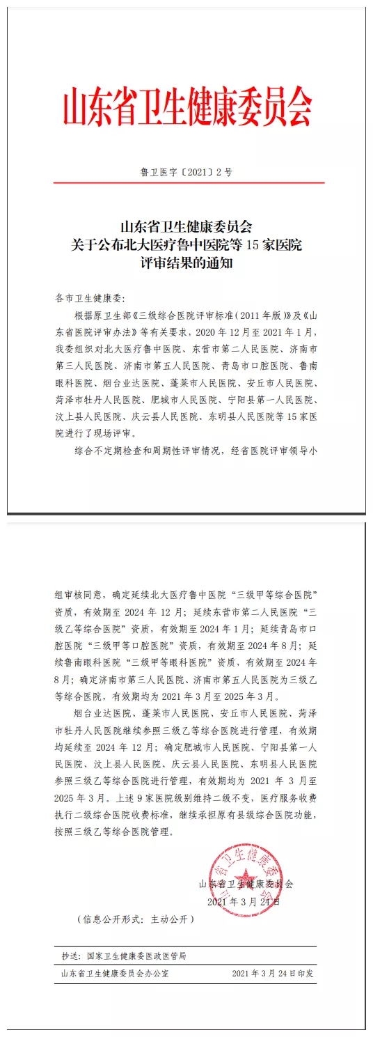 3月24日,山东省卫生健康委员会印发《山东省卫生健康委员会关于公布北大医疗鲁中医院等15家医院评审结果的通知》。青岛市口腔医院通过三甲医院复审。