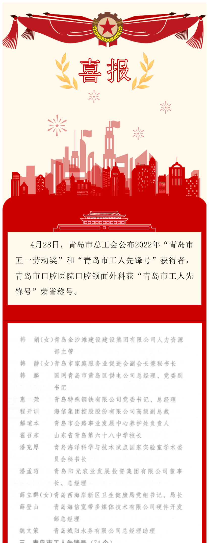 【喜报】青岛市口腔医院口腔颌面外科获2022年"青岛市工人先锋号"荣誉称号