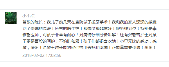2018年2月2日下午,我院官方微信平台收到了化名“小不点”的患者家属留言,对我院口腔颌面外科副主任医师李雅馨和护士张馨誉表达了真切的感激之情,让我们在这飘雪的寒冬里感受到了暖意。其实这只是众多感谢和表扬中的一个,自2017年起我院颌面外科通过电话回访、问诊问卷调查和现场接待等方式,共收到患者锦旗3面、表扬信4封,留言表扬20多条,患者满意度100%。