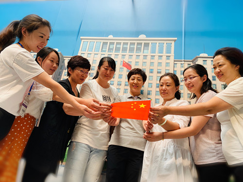 市口腔医院党总支书记王爱莹和副院长张红艳带领中层干部一起与国旗同框,向祖国致敬。