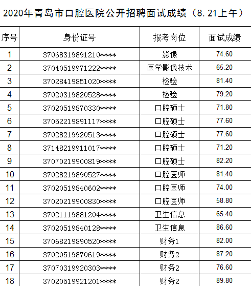 2020年青岛市口腔医院公开招聘面试成绩(8.21上午)