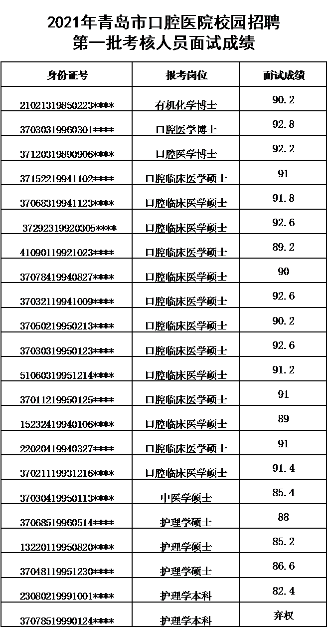 2021年青岛市口腔医院校园招聘第一批考核人员面试成绩
