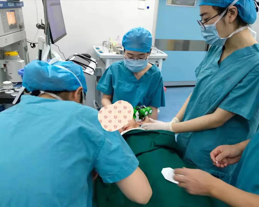 由于术前的沟通,赵霞主任根据然一的性格特点,采取了最合适的麻醉诱导方式。此外,麻醉护士还贴心地为孩子做好各种保护:眼部遮挡防护,嘴唇上涂抹凡士林防干燥,盖上消毒绒毯保暖。