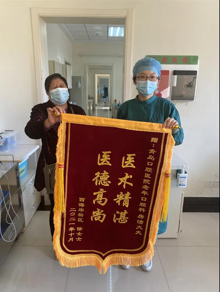 11月1日一早,家住西海岸新区的徐阿姨来到青岛市口腔医院老年口腔科,将一面写着“医德高尚,医术精湛”的锦旗送到房洁医生手中,诚挚表达了自己的感激之情,对医生精湛的医术、耐心的态度连连称赞。