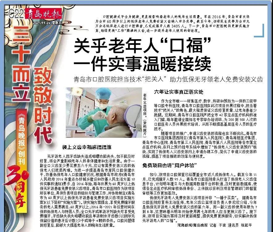 口腔健康关乎全身健康,更直接影响着老年人的晚年生活质量。早在2016年,青岛市首次将为全市60周岁以上的低保老年人免费安装义齿纳入市办实事。截至今年,该项民生实事为全市九万余名低保老人进行口腔筛查,已完成镶牙人数3405人。下一步,青岛市口腔医院将更新实施方案,陆续更换“工作”期满的义齿,进一步提升老年人使用的舒适度。