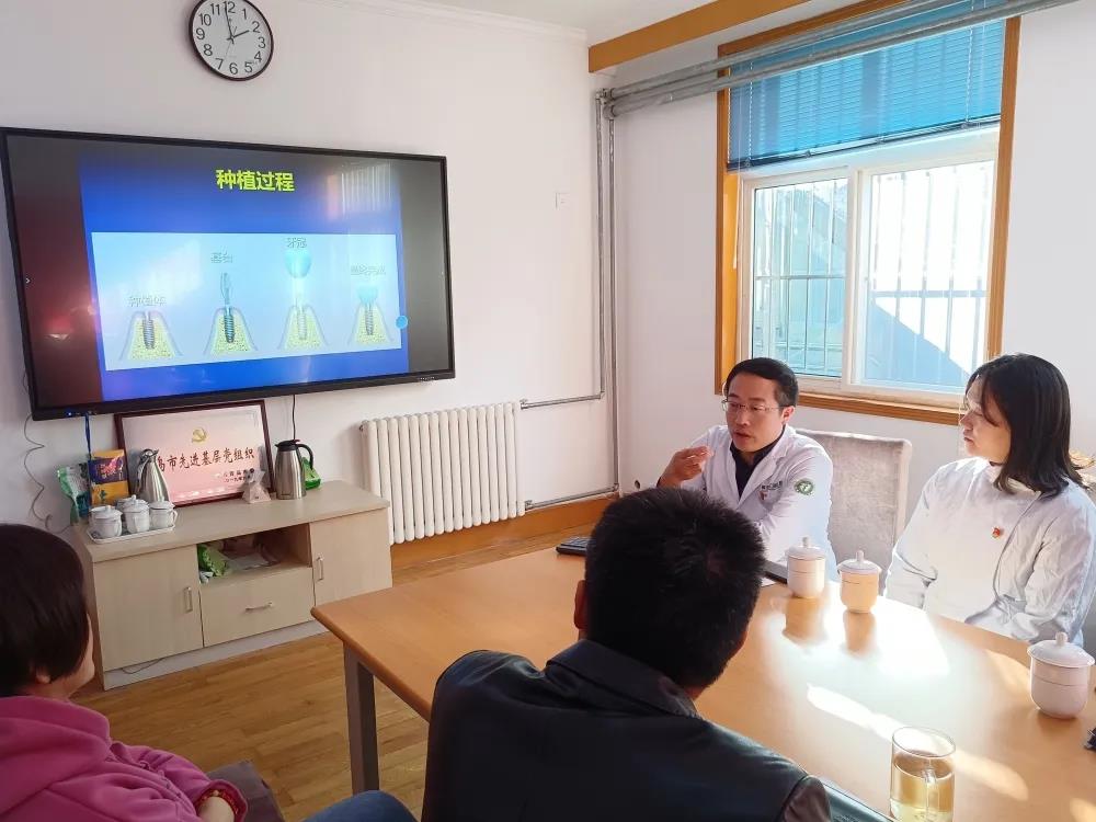 口腔种植科党支部张雪健医生通过通俗易懂、幽默风趣的言语介绍口腔种植的专业知识,为社区居民们讲解什么是种植牙、种植牙的组成以及日后维护等相关知识。