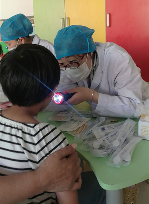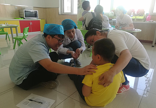 6月20日早晨7点半,所有工作人员到达以琳,在教室内做好查体准备。8点钟,老师带领孩子和家长们来到情景教室,开始了一天的检查。面对语言能力弱的孩子们,工作人员们耐心引导,用最简单的语言,形象的肢体语言与孩子沟通,遇到不配合的孩子,医护人员会轻轻握住孩子的手,亲切的跟孩子交流,与孩子一起坐在地上,跟孩子互动,缓解孩子的紧张心理,也会亲切的抱住孩子,用孩子舒服的姿势给孩子检查。因为提前沟通准备到位,安排合理,检查开展的非常顺利,秩序井然。工作人员的耐心细致,赢得了家长和老师的一致好评,也受到了孩子们的欢迎。孩子们在检查结束时,会在家长的引导下,亲切的与工作人员挥手道别,语言能力较好的孩子,还会在老师家长的陪同引导下,对医生护士们说一句谢谢和再见。这份真诚而温暖的感谢,消除了每一个工作人员的疲惫,心中也充满着欣慰与欢喜。